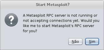Agora clique em Connect e em seguida clique em "Sim" para iniciar os serviços do Metasploit RPC Server.