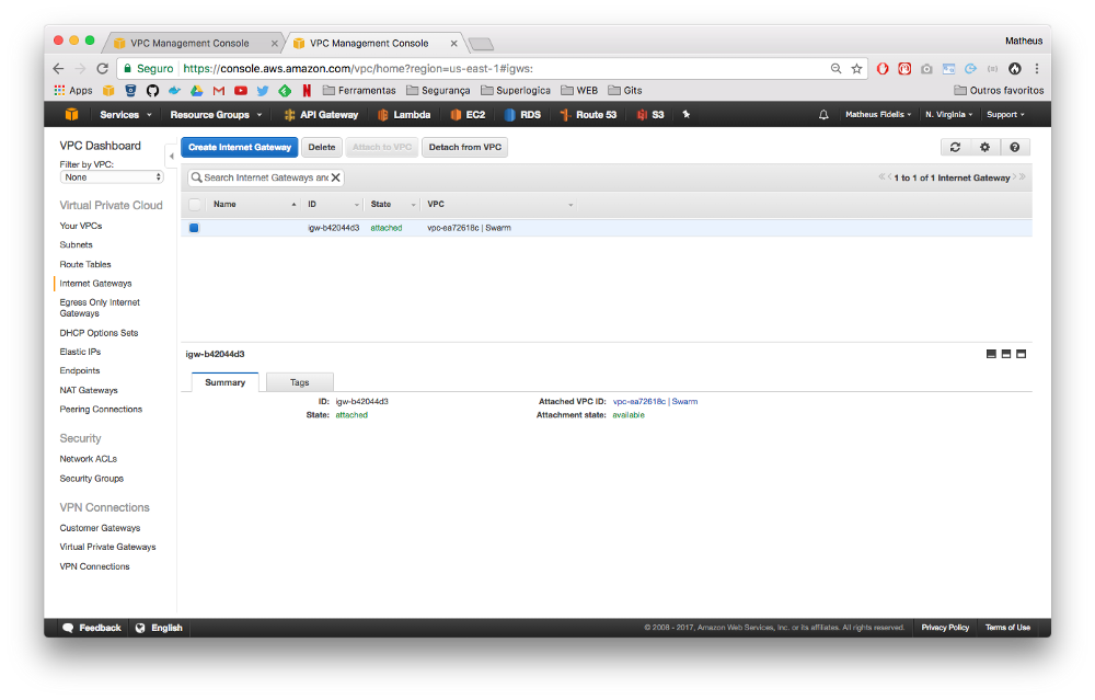 - Clique com o botão direito e selecione “Attach to VPC”. Selecione a VPC do Swarm e salve. Isso irá nos fornecer um acesso a internet dentro da mesma.